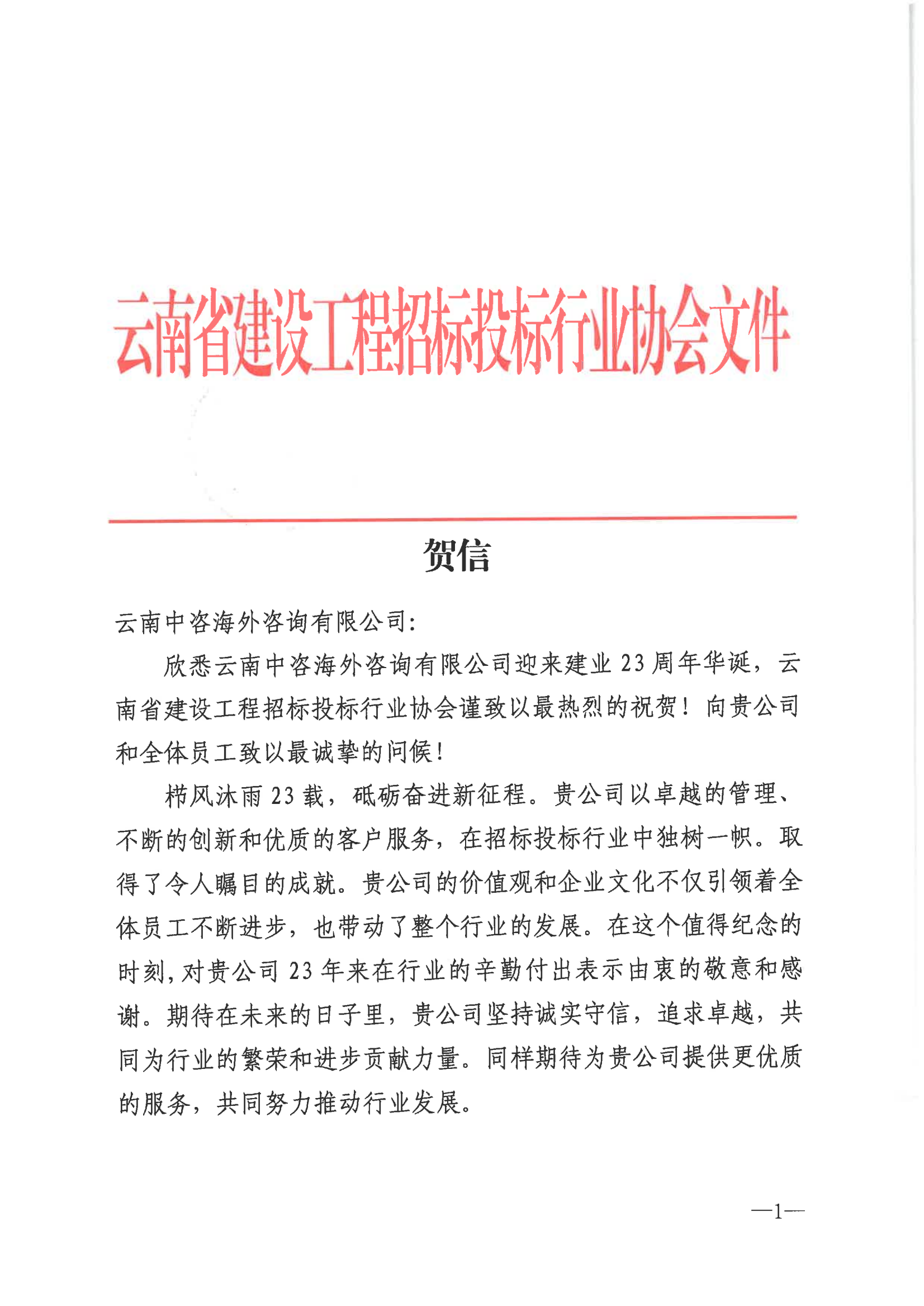值此春節(jié)來臨之際,恰逢我公司成立23年,喜獲云南省建設(shè)工程招標(biāo)投標(biāo)行業(yè)協(xié)會(huì)賀信。這封賀信,承載著行業(yè)對(duì)我們多年拼搏奮進(jìn)的高度認(rèn)可,飽含著對(duì)我們深耕前行的熱忱鼓勵(lì)。我們將秉持初心,以更高品質(zhì)的服務(wù)和產(chǎn)品回饋社會(huì),攜手共創(chuàng)美好未來!